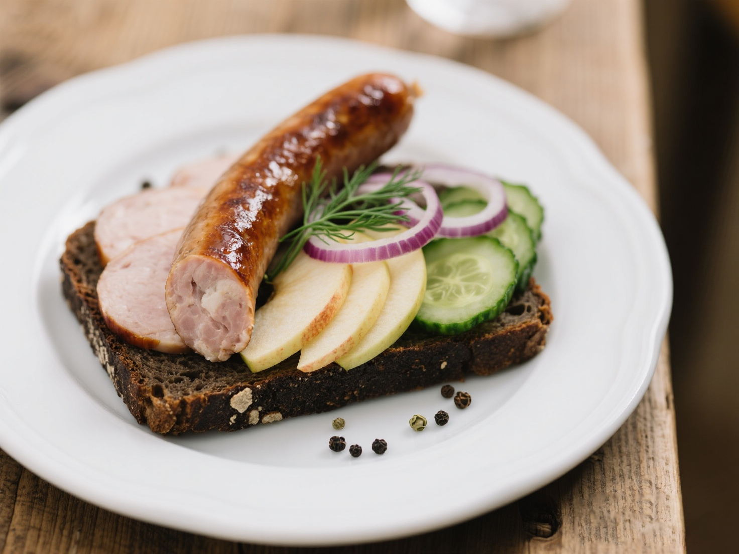 ③ 組裝: 將厚實(shí)的黑麥面包片放入盤中,上面鋪上炒好的焦糖洋蔥,再將煎好的林堡腸放在最上面。