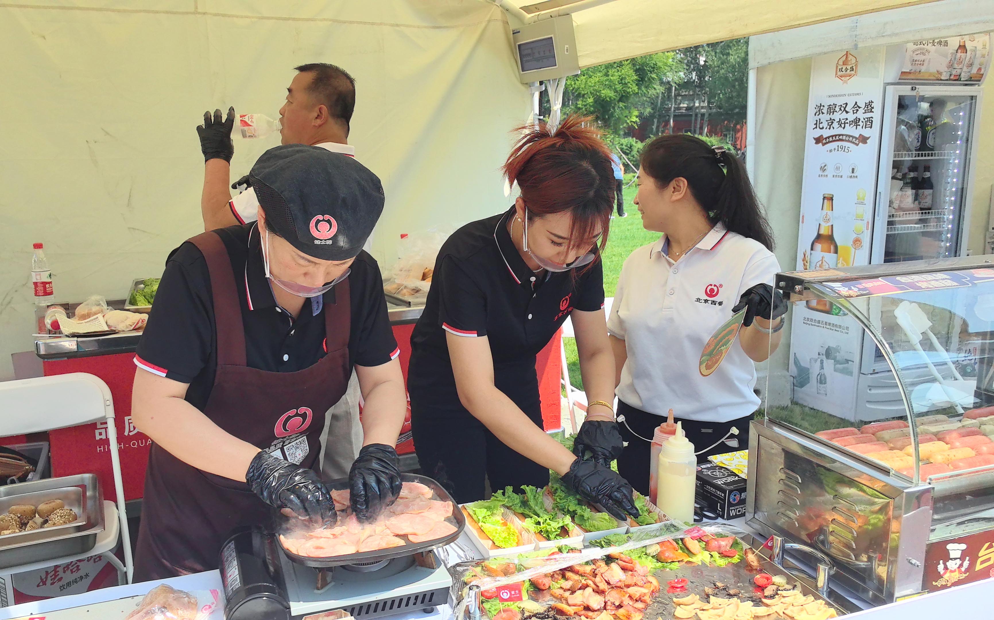 北京西餐的市集攤位早早的忙碌了起來,工作人員將精心挑選的十余款產(chǎn)品,制作成試吃拼盤,還提前準備好了現(xiàn)制熱狗、網(wǎng)紅小漢堡、火腿餐包等特色美食......