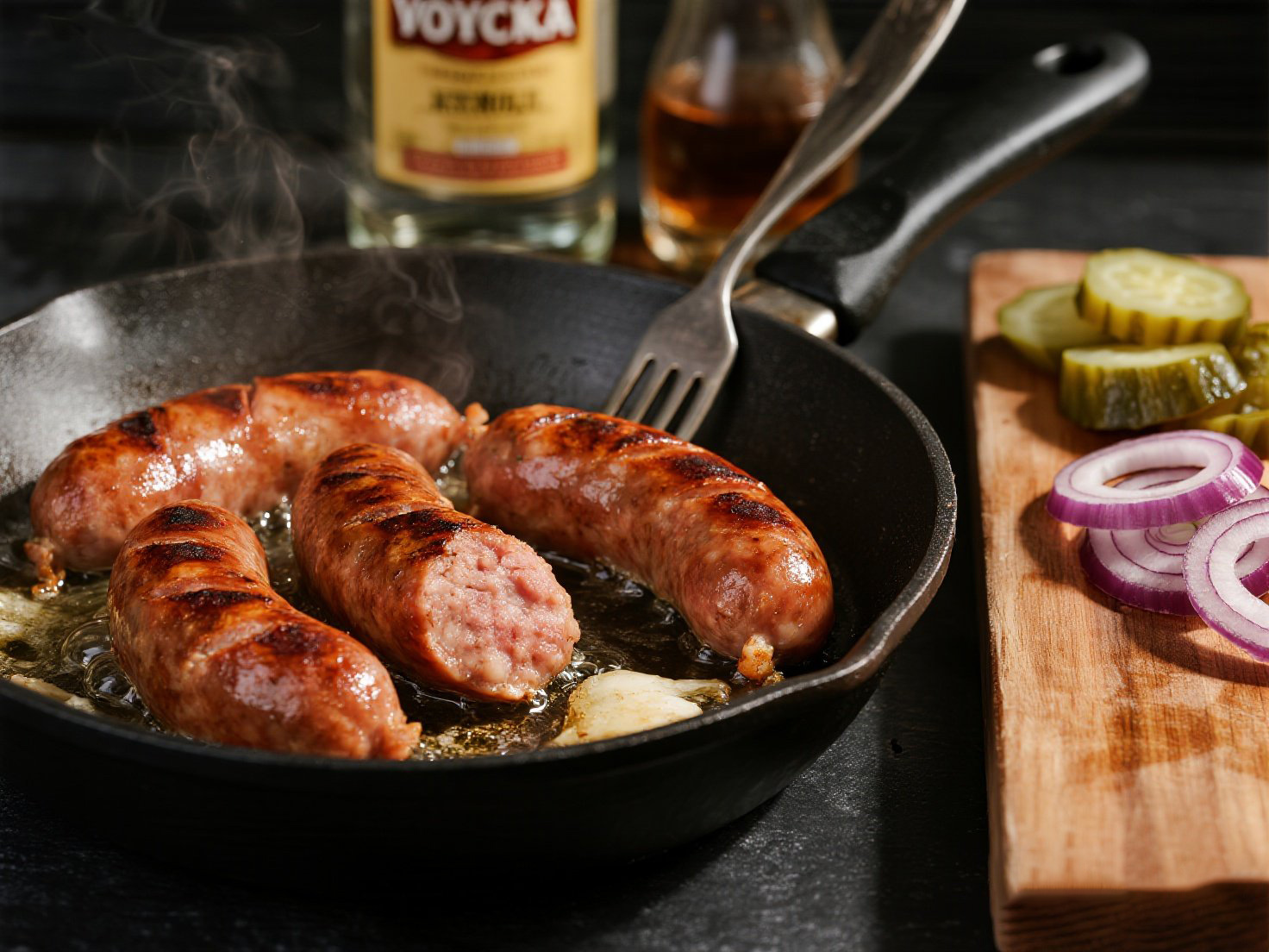 ①冷鍋刷油,放入香腸,兩面煎至焦黃,加入少許水,蓋上鍋蓋水煎,小火慢煎8分鐘左右,直至熟透 → ②香腸切段配酸黃瓜吃。