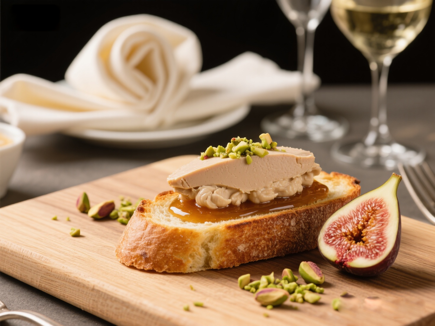 ⑤ 擠上鵝肝慕斯,點(diǎn)綴無(wú)花果醬,撒開(kāi)心果碎。